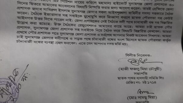 স্টাফ রিপোর্টার, ছাতকসুনামগঞ্জের ছাতক পৌরসভা কার্যালয় কর্তৃক হাটবাজার ও অন্যান্য ইজারা দরপত্র বিজ্ঞপ্তির ৩টি ক্রমিকের বিষয়ে সিলেটের বিভাগীয় কমিশনার বরাবরে একটি লিখিত আবেদন করা হয়েছে। ছাতক পাথর ব্যবসায়ী সমিতি লি: